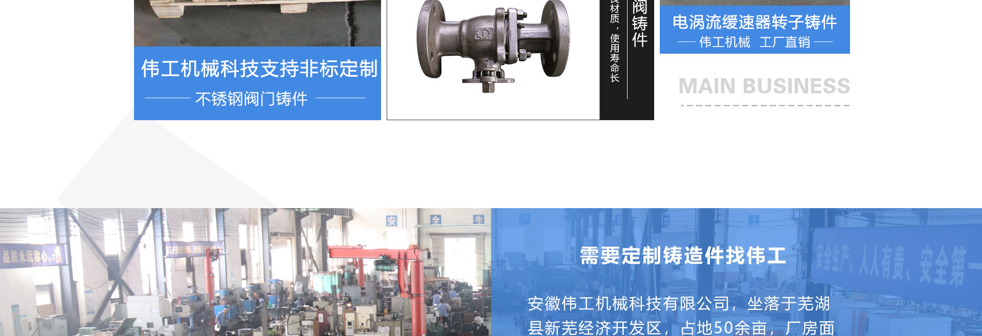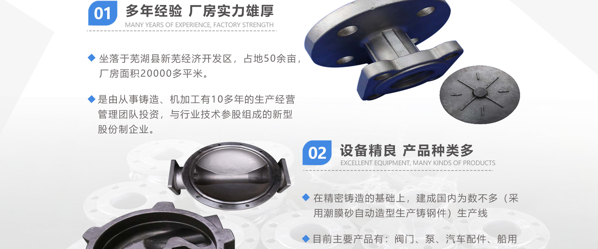 安徽偉工機(jī)械科技有限公司,坐落于安徽蕪湖新蕪經(jīng)濟(jì)開發(fā)區(qū),是一家専業(yè)從事鑄造產(chǎn)品設(shè)計(jì)、研發(fā)、生產(chǎn)、銷售于一體的企業(yè),公司為客戶的產(chǎn)品提供多樣的技術(shù)支持與設(shè)計(jì),公司主要鑄造技術(shù)有潮模砂鑄造、硅溶膠精鑄工藝。主要產(chǎn)品有:不銹鋼閥門配件、泵閥配件、汽車配件、工業(yè)管道配件、工程機(jī)械配件、汽車配件等。材質(zhì)為:低合金鋼、304、316、316L、鉻鉬鋼、哈氏合金、碳鋼、雙相鋼等。公司已先后通過ISO9001和TS16949等多種體系審核,以完備的管理手段和齊全的檢測(cè)設(shè)備滿足客戶需求,進(jìn)的設(shè)備,専業(yè)的技術(shù),嚴(yán)謹(jǐn)?shù)墓芾恚€(wěn)定的質(zhì)量。服務(wù)客戶,鑄造未來,偉工誠摯的歡迎新老客戶共同商洽合作